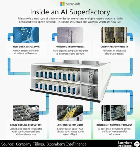 Microsoft unveiled its first AI superfactory on Nov. 12 in Atlanta. The superfactory is a network of connected data centers in Georgia and Wisconsin designed to handle massive workloads, like training large language models. These facilities are built on Microsoft’s Fairwater architecture, and the framework reduces risk if, for example, an AI lab is unable to fulfill its training-contract commitments. In such a scenario, the company can reduce its capital spending and shift data-center resources toward inferencing, which caters to its various copilot products. Microsoft can also use it to provide infrastructure to its own AI research.