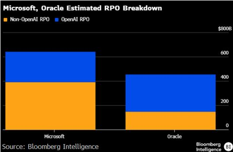 Microsoft’s backlog of $392 billion doesn’t include the $250 billion commitment made by OpenAI, which most likely spans 7-8 years. Microsoft is OpenAI’s biggest cloud partner, and our analysis suggests most of that revenue will be from long-tail inferencing work and not training. In contrast, we estimate around two-thirds of Oracle’s $455 billion RPO to be from OpenAI, with the majority of this revenue stream tied to training workloads.