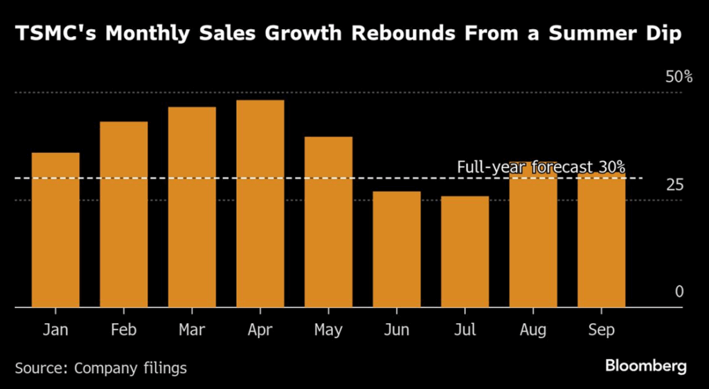 (Bloomberg) — Taiwan Semiconductor Manufacturing Co. reported a 30% increase in its third-quarter sales as major US tech companies continued to make multibillion-dollar bets on AI.